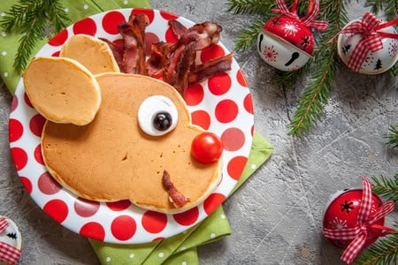 This adorable reindeer pancake breakfast features a large pancake for the face, two smaller pancakes for ears, and bacon strips cleverly arranged as antlers. A banana slice and blueberry form a wide-eyed look, while a cherry tomato is used for the nose (you could also use a strawberry or large red candy). A curved piece of bacon creates the little smile.