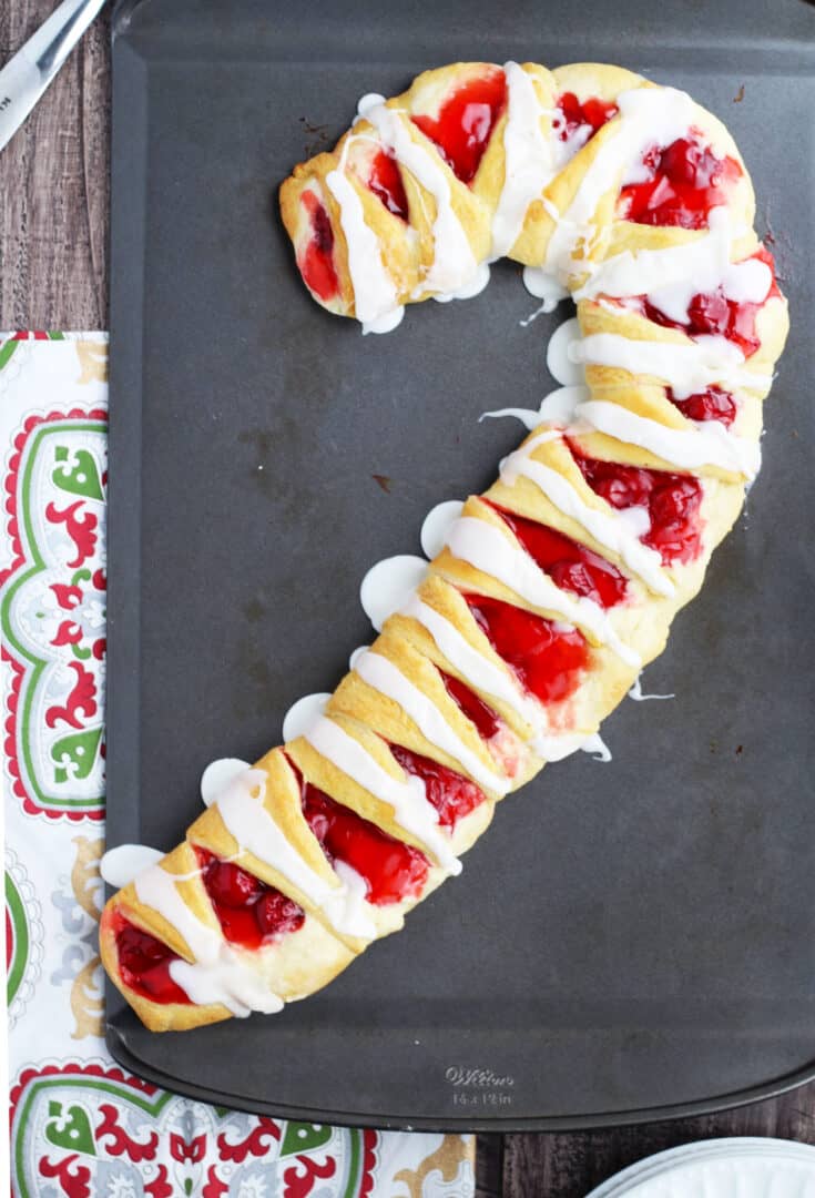 This festive breakfast uses crescent roll dough shaped into a candy cane, then filled with a sweetened cream cheese and cherry pie filling combo that peeks through the folds like red stripes. The soft, gooey center contrasts perfectly with the golden flaky crust, and a simple powdered sugar glaze drizzled over the top adds the final touch of sweetness.