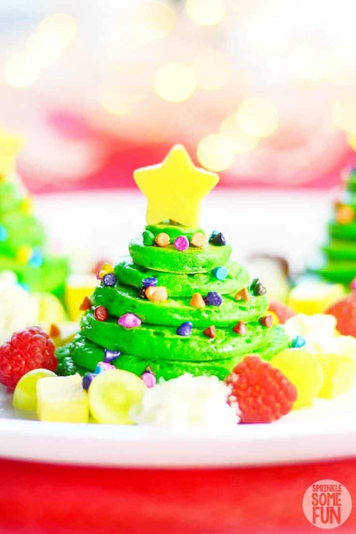 These pancakes use green‑tinted batter (thanks to food coloring) flavored with almond extract is cooked into graduating sizes, then stacked from largest to smallest to form a mini “tree” on the plate.