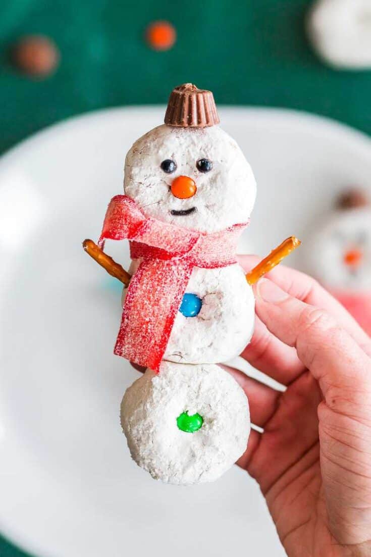 This fun treat stacks three powdered‑sugar mini‑donuts on a stick, then uses candy and pretzel pieces to turn each stack into a snowman—little hat (mini Reese’s), eyes (sprinkles), carrot nose (M&M) and pretzel‑stick arms. The whole assembly takes under ten minutes and can be turned into a fun craft‑meets‑breakfast activity.