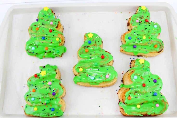 After baking, the rolls are iced with a mix of the included icing plus an extra batch dyed green, then decorated with candies and a star to mimic ornaments. The quick prep and use of store‑bought dough make this ideal for a simple yet festive breakfast when time is tight.