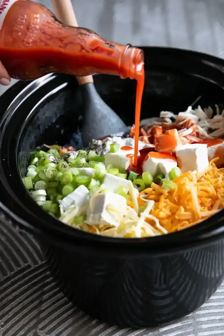 This dip is loaded with shredded chicken, cream cheese, ranch dressing, hot sauce, cheddar, mozzarella, and green onions for that classic buffalo wing flavor in a creamy, scoopable form. Everything melts together in the slow cooker into a rich, cheesy dip with just the right amount of heat. The texture is thick and hearty, so it clings beautifully to chips and veggies. It’s an easy, transportable choice for potlucks and tailgating.