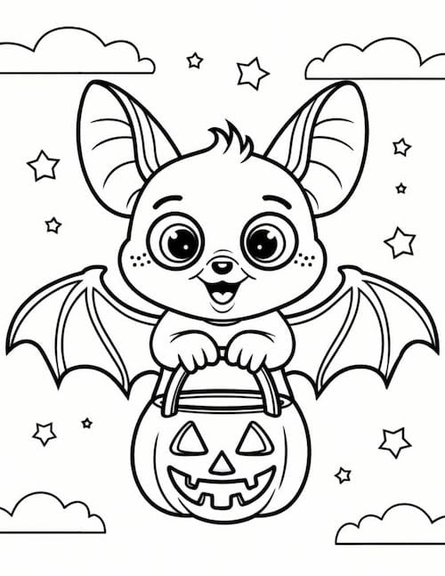 This adorable bat flying in front of a full moon carrying a pumpkin would make a fun activity for kids in elementary school.