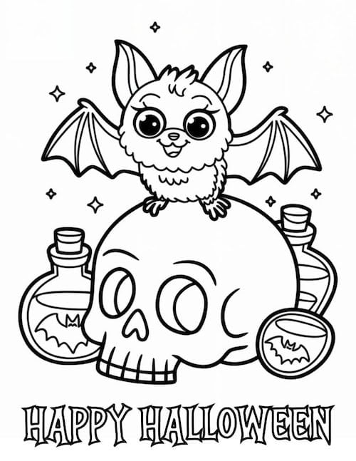 An adorable bat is sitting on a spooky skull surrounded by potion bottles.