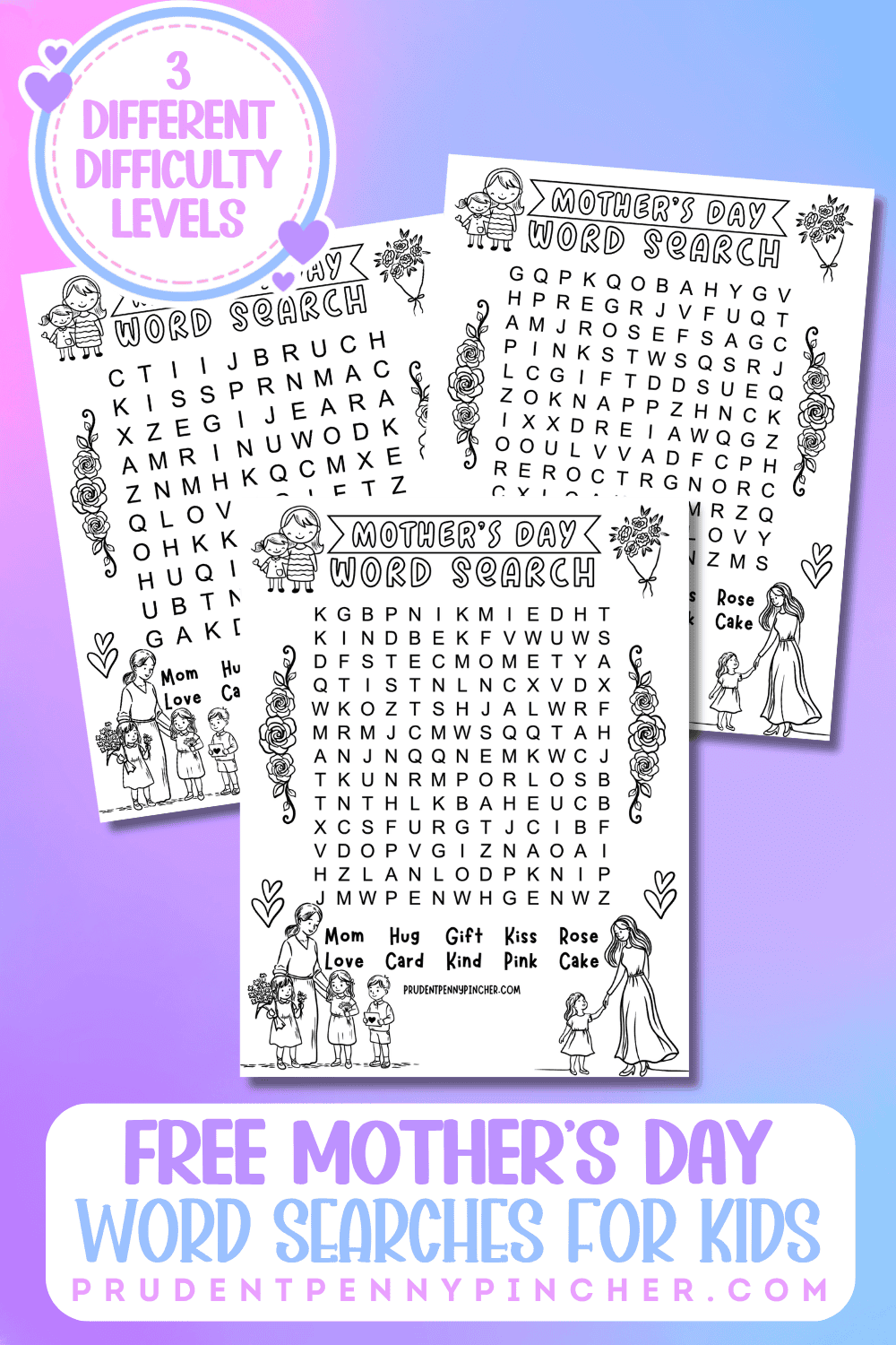 • All 3 puzzle pages use the same 10 Mother's Day words, which makes it easy to pick a difficulty level based on age or skill without changing the overall theme.