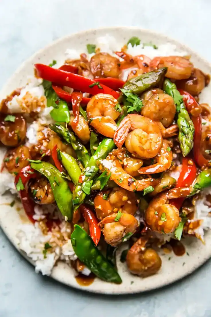 This stir fry pairs juicy shrimp with a rainbow mix of red bell pepper, asparagus, and snow peas in a glossy garlic-soy sauce. The sauce layers low-sodium soy sauce or tamari, sesame oil, chili sauce, and a touch of brown sugar for a savory-sweet finish that coats every bite. With lean shrimp and plenty of fiber-rich vegetables, it clocks in at about 210 calories per serving. It’s a dairy-free, one-pan dinner that keeps things light but packed full of flavor.