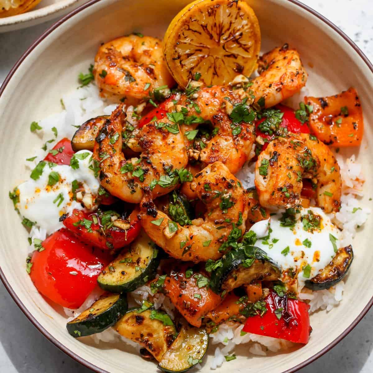 These bowls layer marinated shrimp, zucchini, bell peppers, and hearty grains like farro, rice, or quinoa, then finish everything with a tangy lemon-garlic Greek yogurt sauce. Smoked paprika, oregano, lemon, and olive oil give the dish bold Mediterranean flavor without relying on heavy creams or rich sauces. The bowls offer about 23 grams of protein per serving and are packed with fiber, vitamin C, and colorful vegetables. It’s a versatile, make-ahead-friendly meal that can easily be tailored with different veggies or grains while staying firmly in the “healthy grain bowl” category.