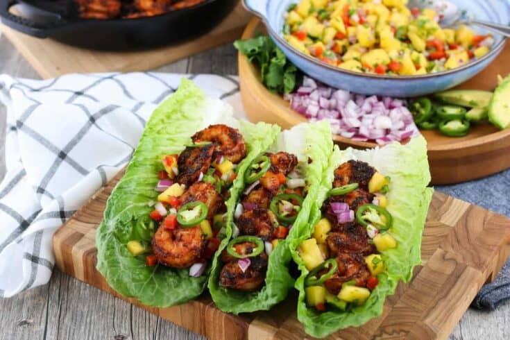 These tacos feature jumbo shrimp tossed in a bold homemade blackened seasoning and piled into crisp lettuce leaves instead of tortillas. They’re finished with fresh toppings like mango salsa, red onion, avocado, cilantro, and lime for a bright, spicy-sweet flavor combo. The recipe is designed to be done in around 15 minutes, making it an easy option for busy weeknights or Taco Tuesday. Because it uses lettuce wraps, olive oil, and a spice blend instead of dairy- or sugar-heavy sauces, it stays Whole30-friendly, gluten-free, and lower in carbs.